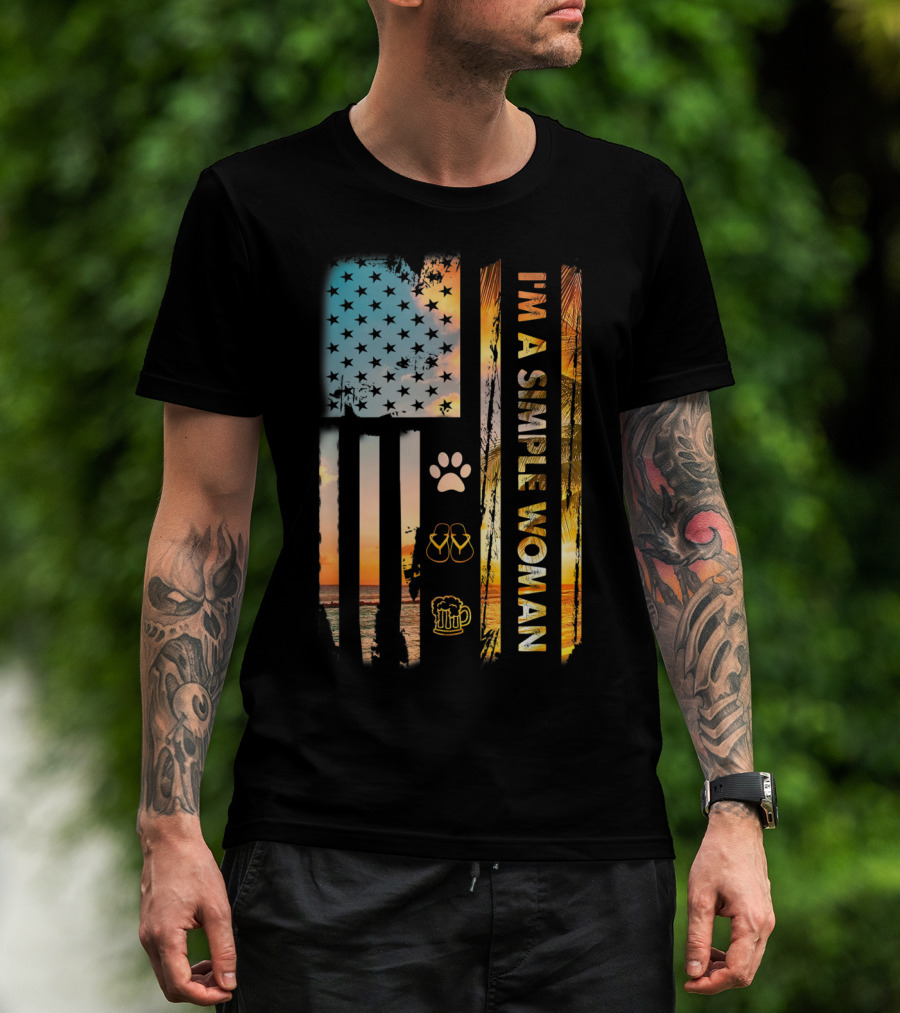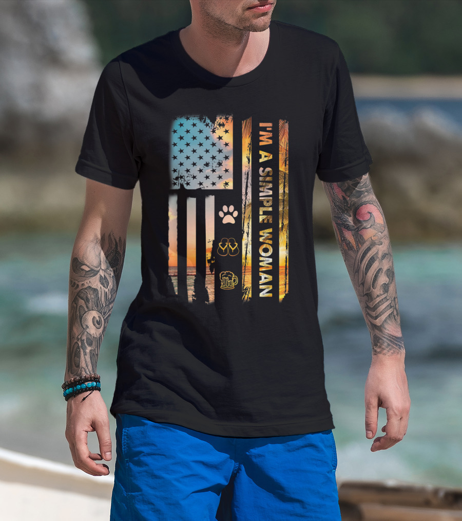 I'm A Simple Woman American Flag Dog Paw Flip Flops Beer Beach Sunset T-Shirt