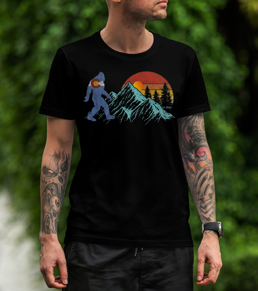 Bigfoot Colorado Flag Retro Sun Mountains And Trees T-Shirt