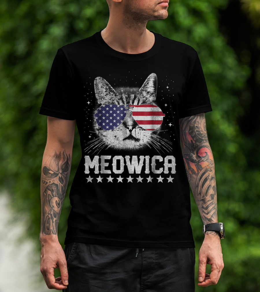 MEOWICA American Flag Cat With USA Sunglasses Stars T-Shirt