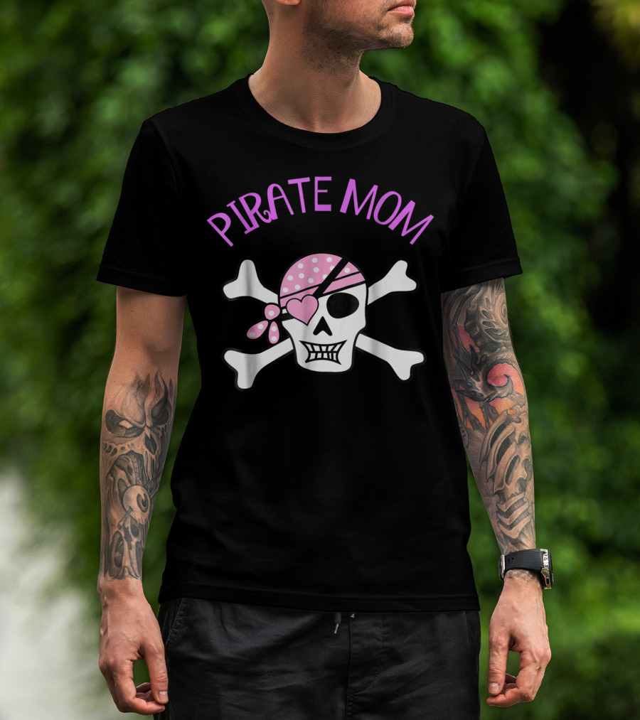 Pirate Mom Skull Cross Bones Jolly Roger With Pink Bandana And Heart Eye Patch T-Shirt