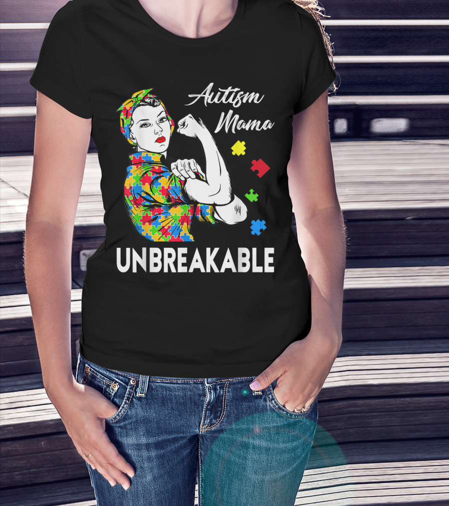 Autism Mama Unbreakable With Puzzle Pieces Rosie The Riveter Autism Awareness T-Shirt