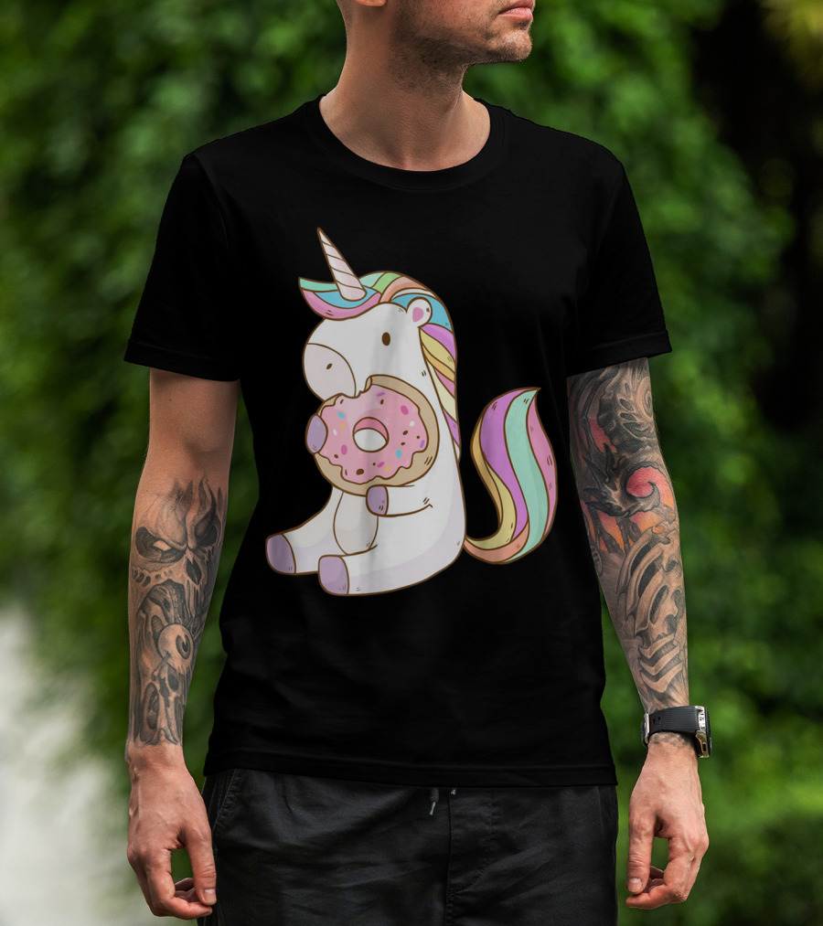 The Cute Hungry Unicorn Enjoying a Delicious Donut with Sprinkles T-shirt is designed for everyday wear and a consistent fit. Fabric is pre-shrunk ring-spun cotton with durable stitching. See the size chart below for exact measurements.