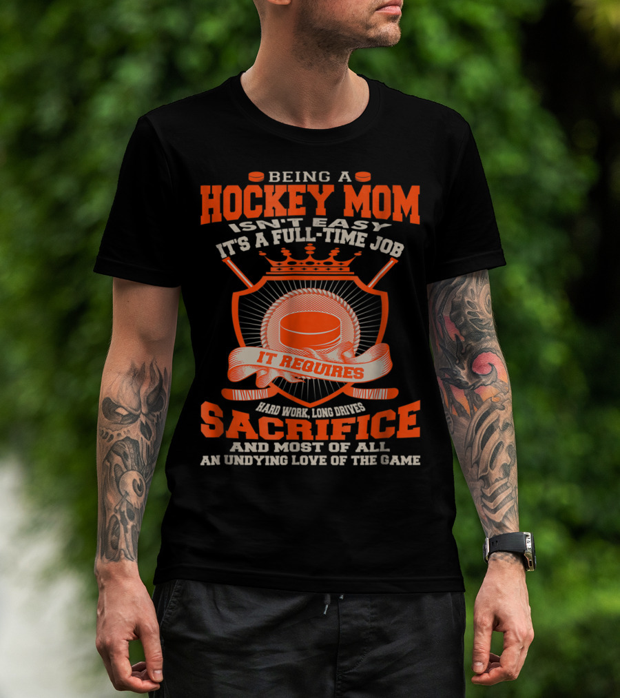 The Being A Hockey Mom Isn't Easy It's A Full-Time Job It Requires Sacrifice And Most Of All An Undying Love Of The Game T-shirt is designed for everyday wear and a consistent fit. Fabric is pre-shrunk ring-spun cotton with durable stitching. See the size chart below for exact measurements.