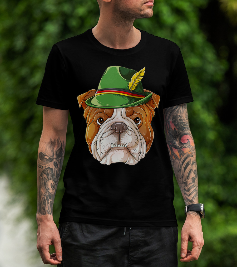 English Bulldog Oktoberfest Boys Lederhosen With Green Hat And Feather T-Shirt