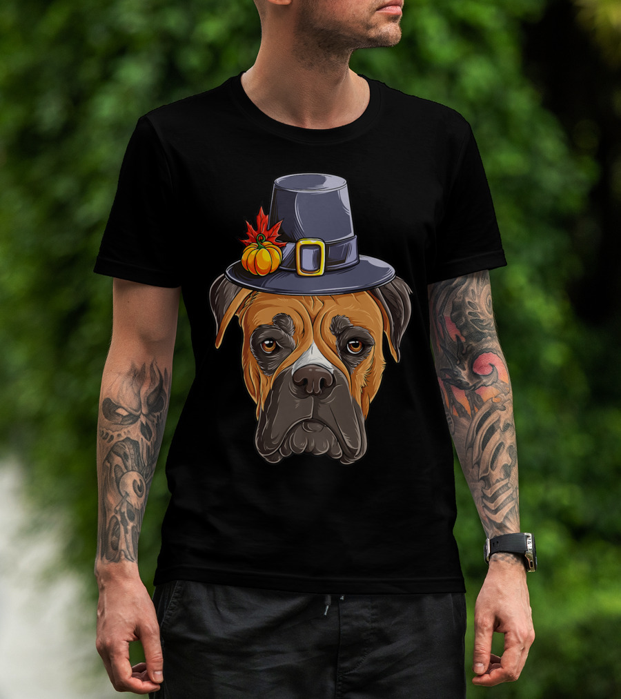 Thanksgiving Boxer Dog Pilgrim Hat Pumpkin Leaf T-Shirt