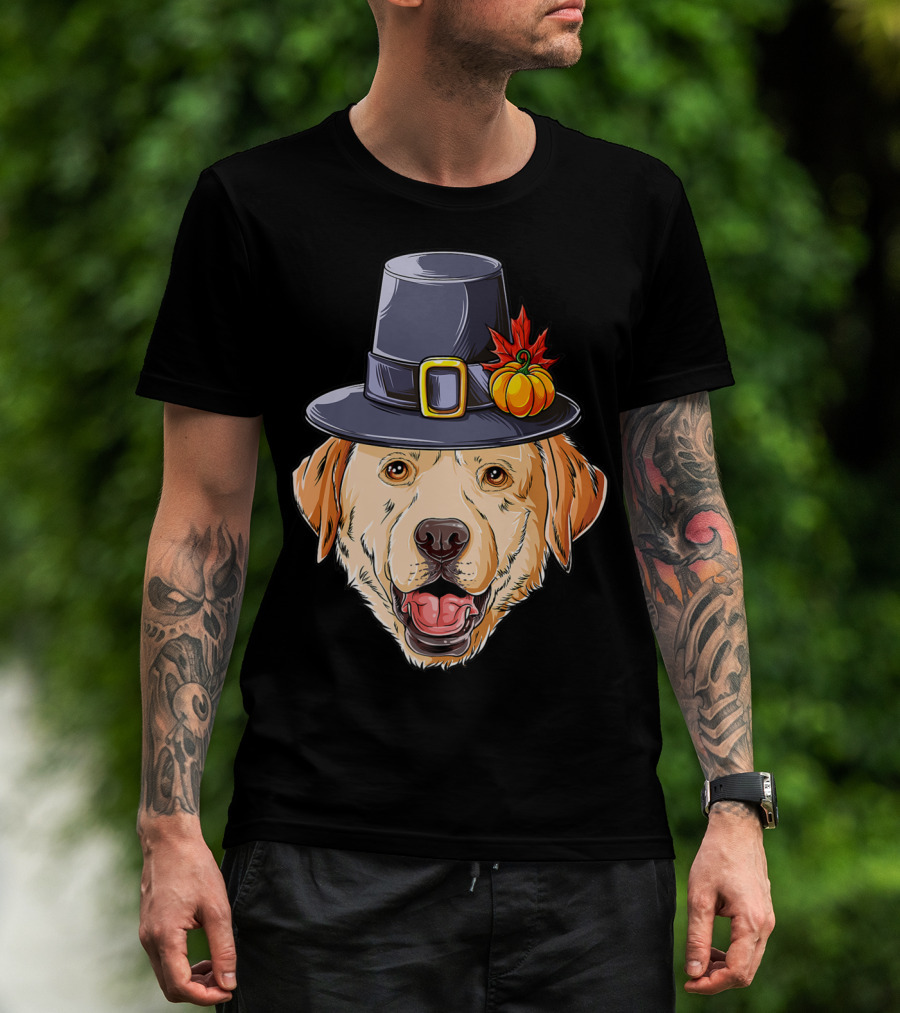 Thanksgiving Dog In Pilgrim Hat With Pumpkin And Leaf T-Shirt
