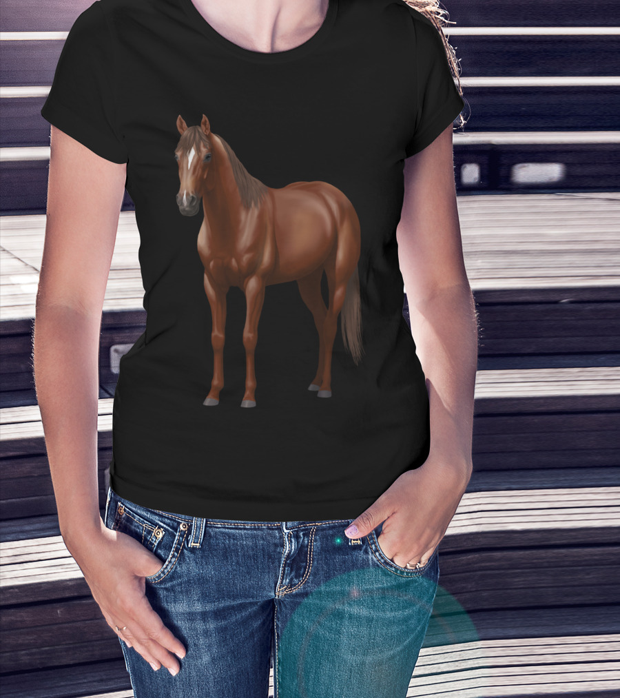 The Dark Sorrel Chestnut Quarter Horse Stallion Majestic T-shirt is designed for everyday wear and a consistent fit. Fabric is pre-shrunk ring-spun cotton with durable stitching. See the size chart below for exact measurements.