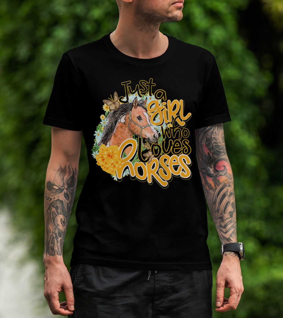 The Just A Girl Who Loves Horses Butterfly and Floral T-shirt is designed for everyday wear and a consistent fit. Fabric is pre-shrunk ring-spun cotton with durable stitching. See the size chart below for exact measurements.
