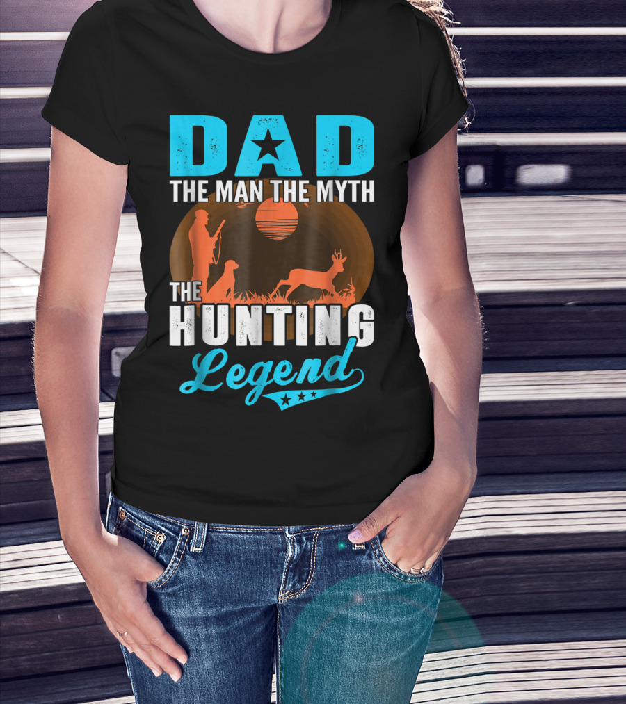 Dad The Man The Myth The Hunting Legend With Hunter Dog Deer And Sunset T-Shirt