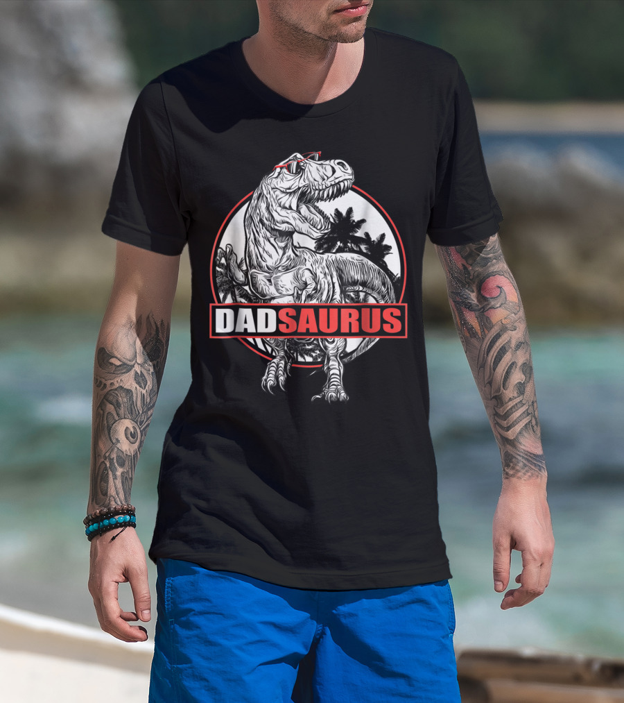 The Dadsaurus Rex Dad Saurus Dinosaur Papa68 Jurassic Style T-Rex with Sunglasses T-shirt is designed for everyday wear and a consistent fit. Fabric is pre-shrunk ring-spun cotton with durable stitching. See the size chart below for exact measurements.
