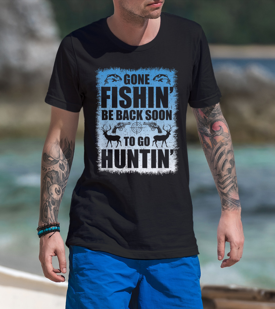 Gone Fishin' Be Back Soon To Go Huntin' Funny Hunters With Fish And Deer T-Shirt