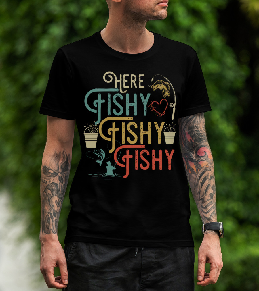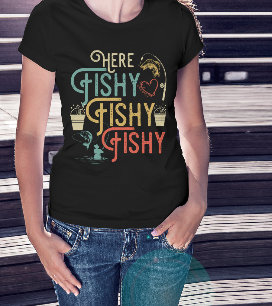 The Here Fishy Fishy Fishy Best Humor Fishing Rod Heart Buckets and Fish T-shirt is designed for everyday wear and a consistent fit. Fabric is pre-shrunk ring-spun cotton with durable stitching. See the size chart below for exact measurements.