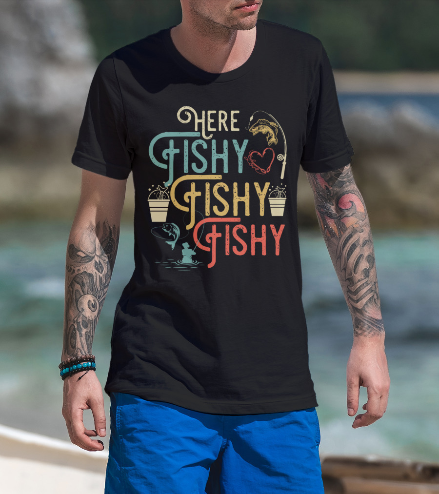 Here Fishy Fishy Fishy Best Humor Fishing Rod Heart Buckets And Fish T-Shirt
