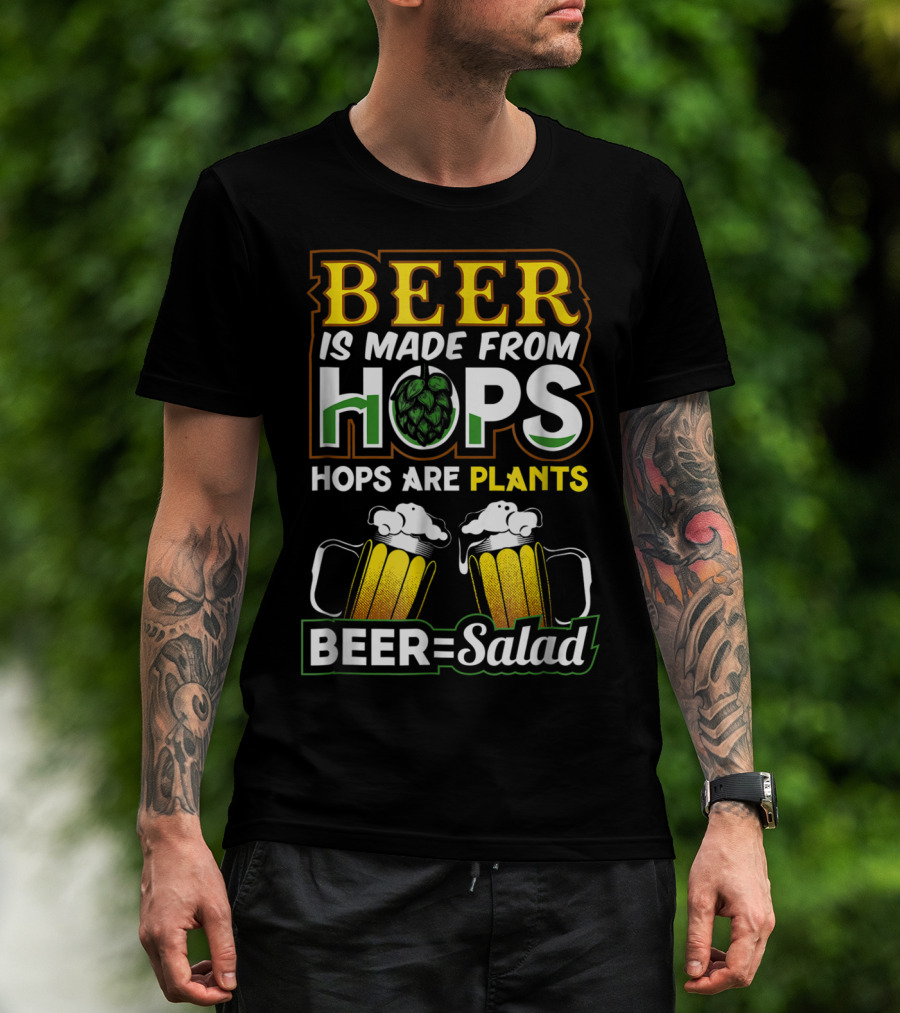 The BEER IS MADE FROM HOPS HOPS ARE PLANTS BEER=SALAD T-shirt is designed for everyday wear and a consistent fit. Fabric is pre-shrunk ring-spun cotton with durable stitching. See the size chart below for exact measurements.