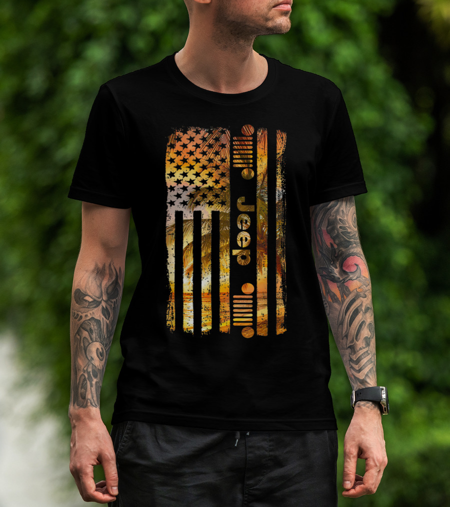 The Jeep American Flag Tropical Palm Beach Summer T-shirt is designed for everyday wear and a consistent fit. Fabric is pre-shrunk ring-spun cotton with durable stitching. See the size chart below for exact measurements.
