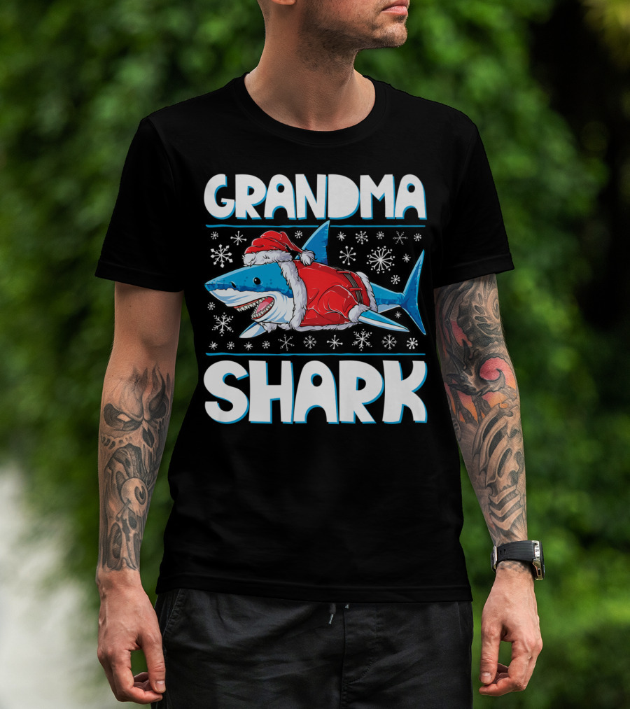 The Grandma Shark Santa Christmas Matching Family Snowflakes T-shirt is designed for everyday wear and a consistent fit. Fabric is pre-shrunk ring-spun cotton with durable stitching. See the size chart below for exact measurements.