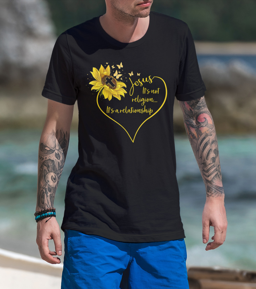 Jesus It's Not Religion It's A Relationship Sunflower Heart Cross Butterflies T-Shirt