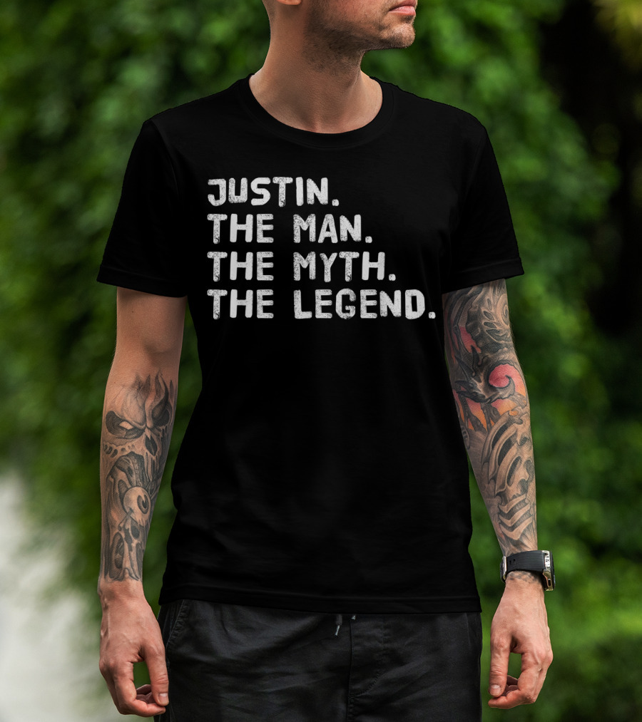 The Justin The Man The Myth The Legend T-shirt is designed for everyday wear and a consistent fit. Fabric is pre-shrunk ring-spun cotton with durable stitching. See the size chart below for exact measurements.