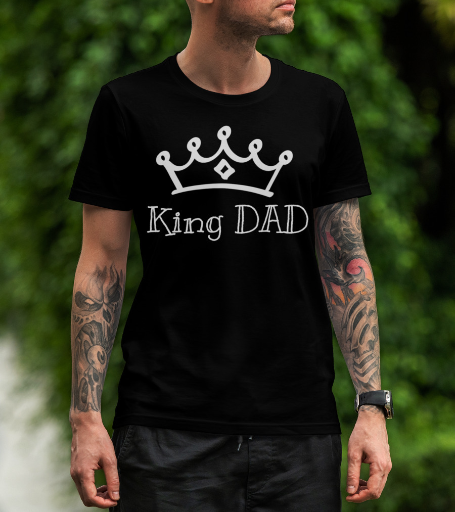 The King Dad with Crown Icon Bold Fun Text T-shirt is designed for everyday wear and a consistent fit. Fabric is pre-shrunk ring-spun cotton with durable stitching. See the size chart below for exact measurements.