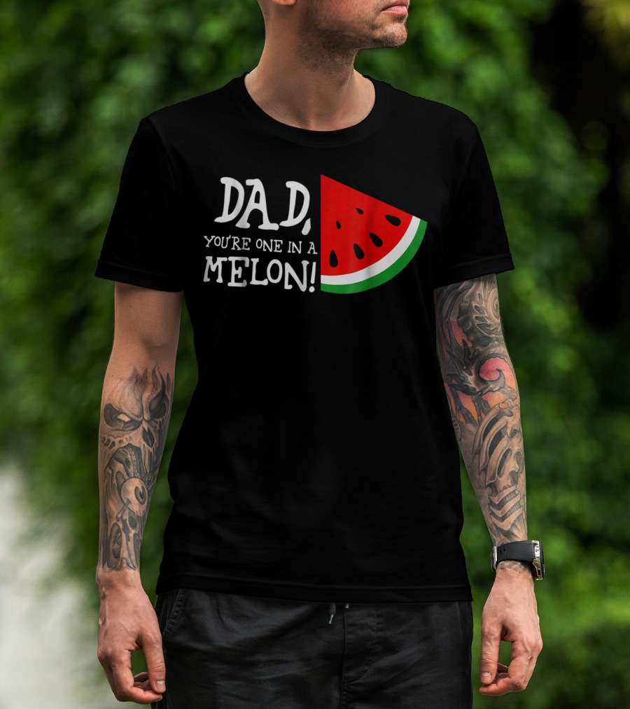 The Dad You're One In a Melon Summer Tropical Fruit Watermelon Slice T-shirt is designed for everyday wear and a consistent fit. Fabric is pre-shrunk ring-spun cotton with durable stitching. See the size chart below for exact measurements.