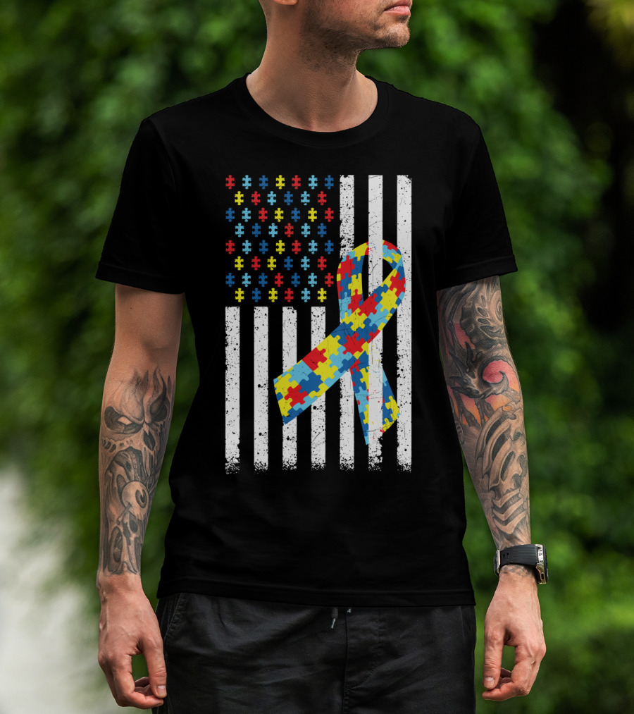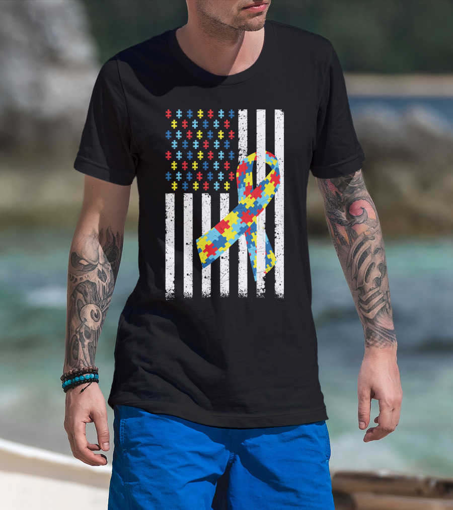 American Flag Jigsaw Puzzle Ribbon Autism Awareness T-Shirt