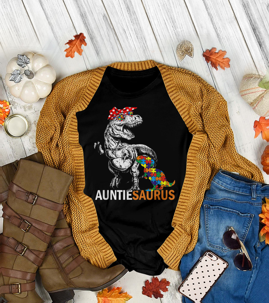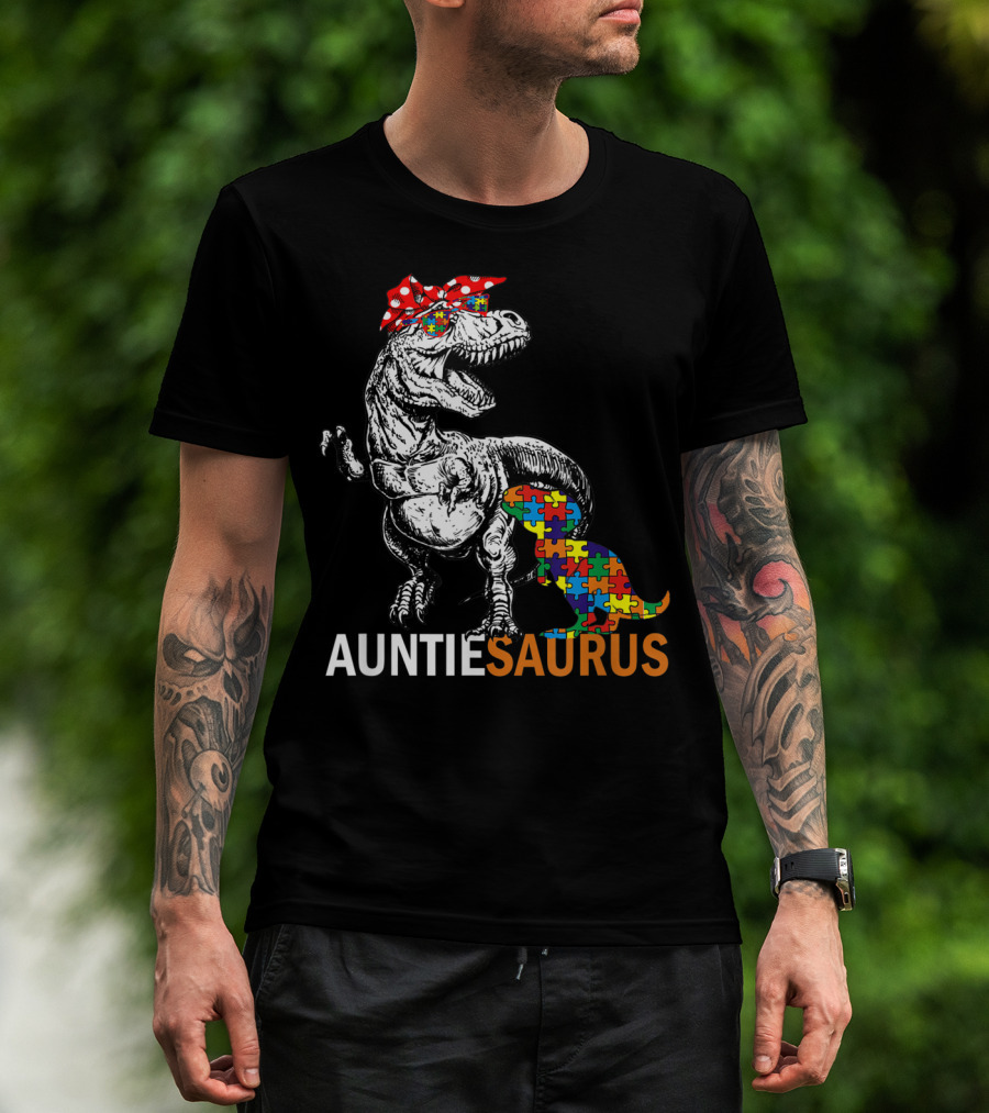 Auntie Saurus Autism Awareness Dinosaur With Puzzle Pieces And Bow T-Shirt