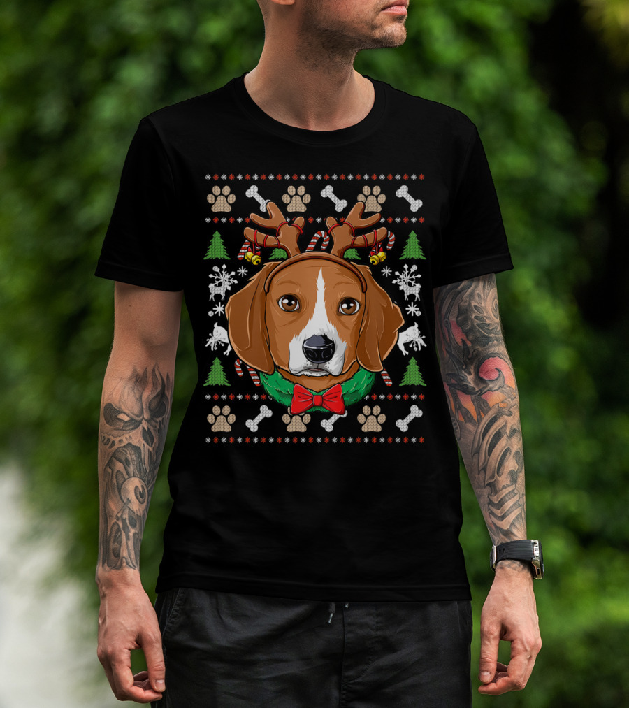 The Beagle Reindeer Antlers Ugly Christmas Sweater Paw Prints T-shirt is designed for everyday wear and a consistent fit. Fabric is pre-shrunk ring-spun cotton with durable stitching. See the size chart below for exact measurements.