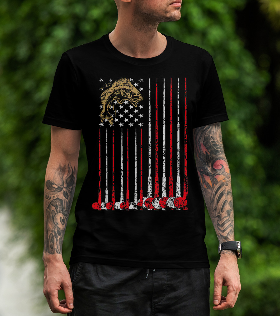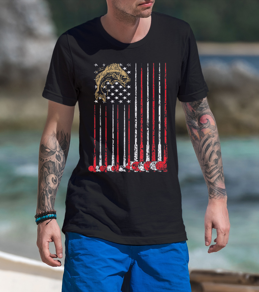 The American Flag Fishing Bass with Independence Day T-shirt is designed for everyday wear and a consistent fit. Fabric is pre-shrunk ring-spun cotton with durable stitching. See the size chart below for exact measurements.