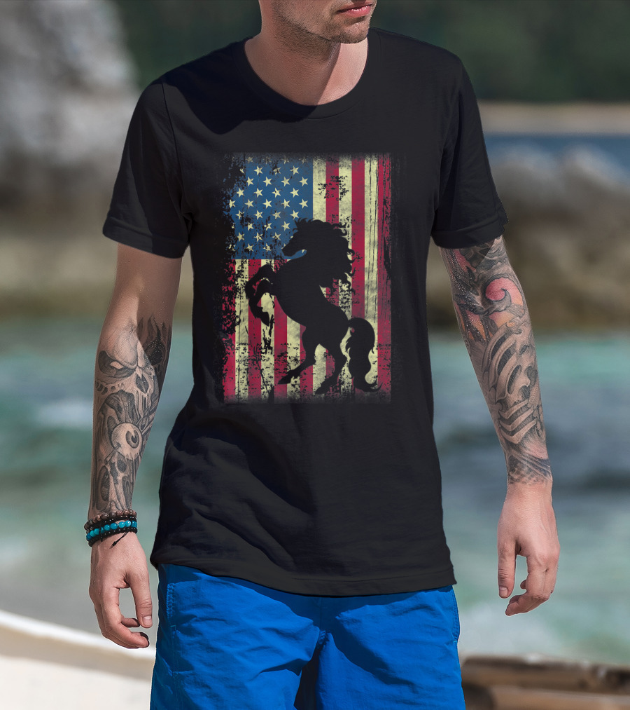 The USA Patriotic Horse and American Flag T-shirt is designed for everyday wear and a consistent fit. Fabric is pre-shrunk ring-spun cotton with durable stitching. See the size chart below for exact measurements.