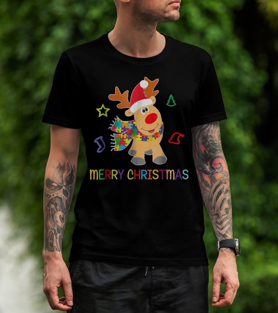 Merry Christmas Autism Awareness Reindeer Puzzle Scarf Holiday Kids 65 T-Shirt
