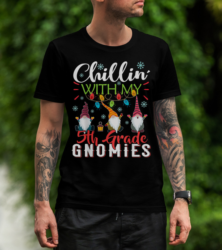 Chillin With My 5th Grade Gnomies Teacher Christmas Lights Snowflakes Gnome Trio T-Shirt