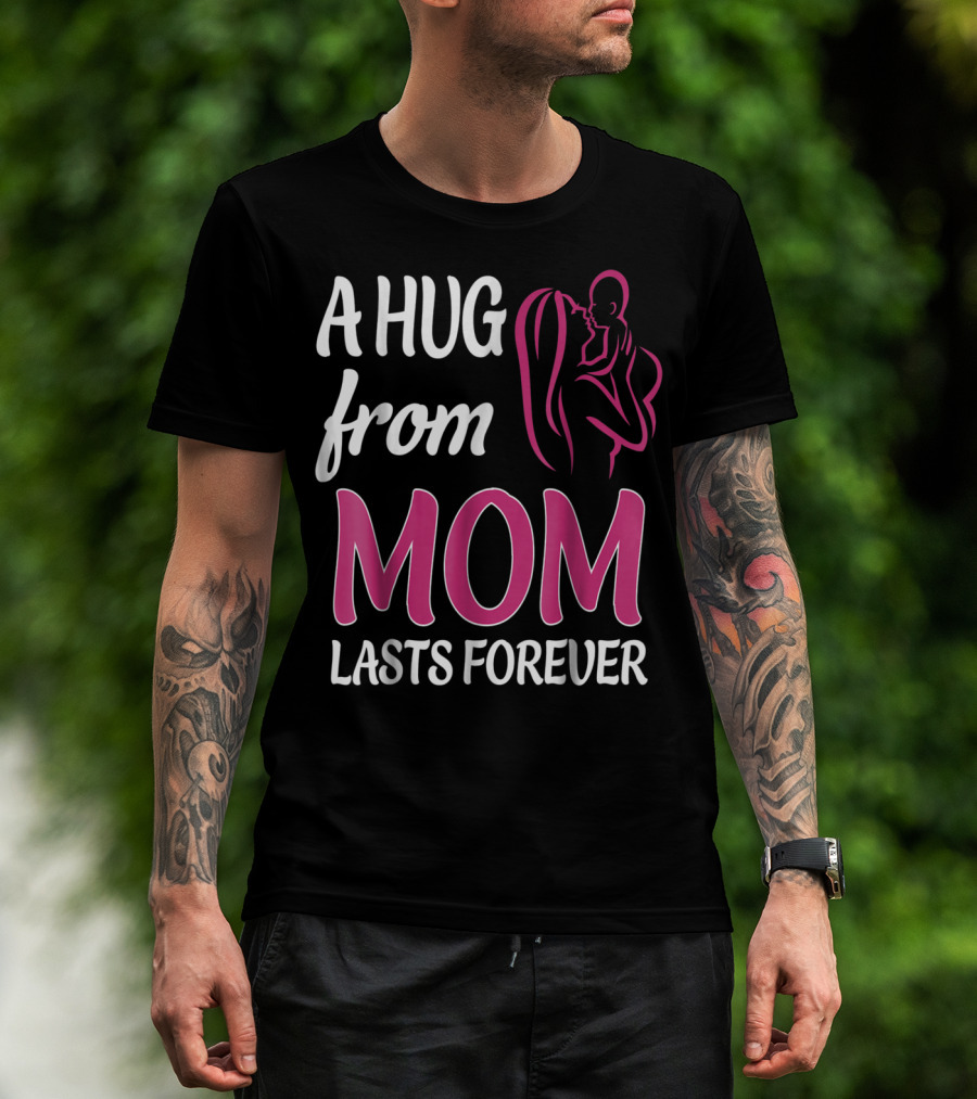 The A Hug From Mom Lasts Forever T-shirt is designed for everyday wear and a consistent fit. Fabric is pre-shrunk ring-spun cotton with durable stitching. See the size chart below for exact measurements.