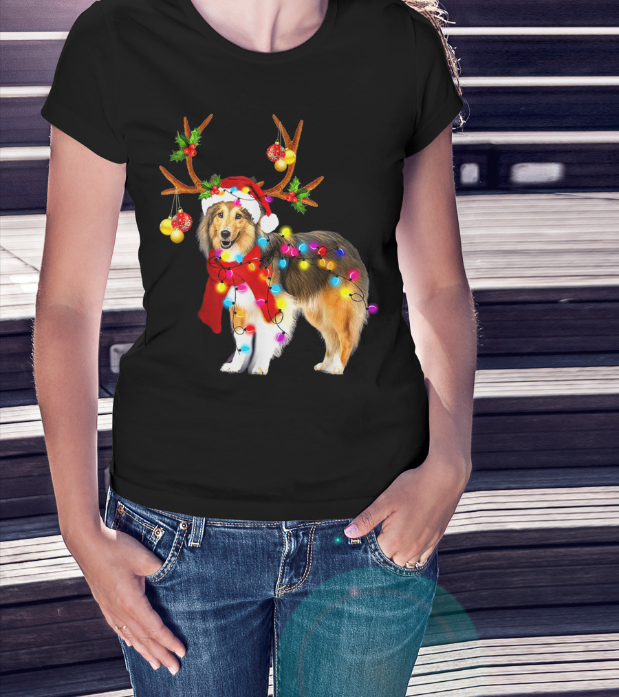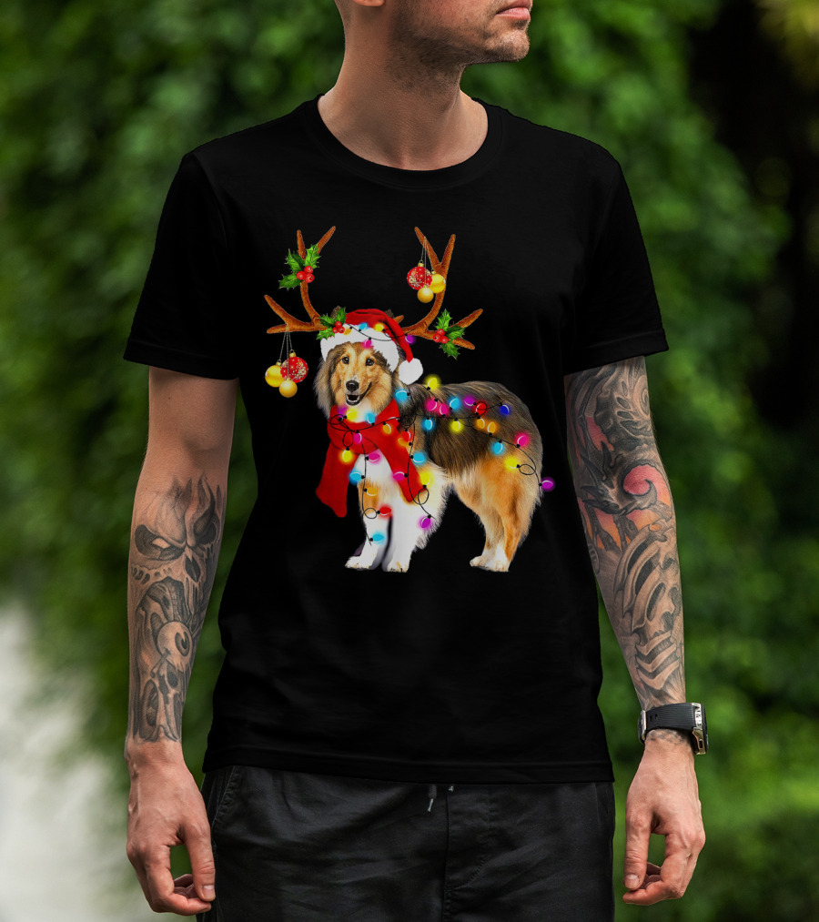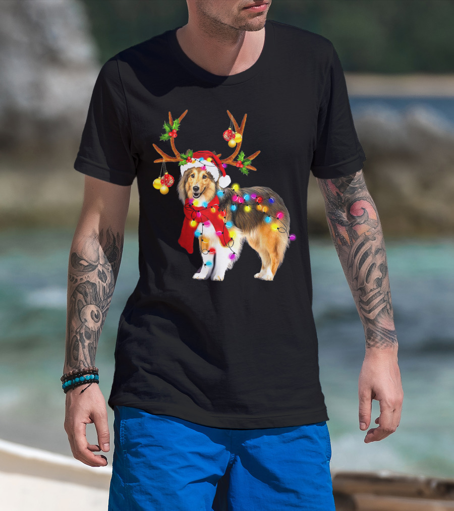 Christmas Sheltie Dog In Santa Hat With Reindeer Antlers And Colorful String Lights T-Shirt