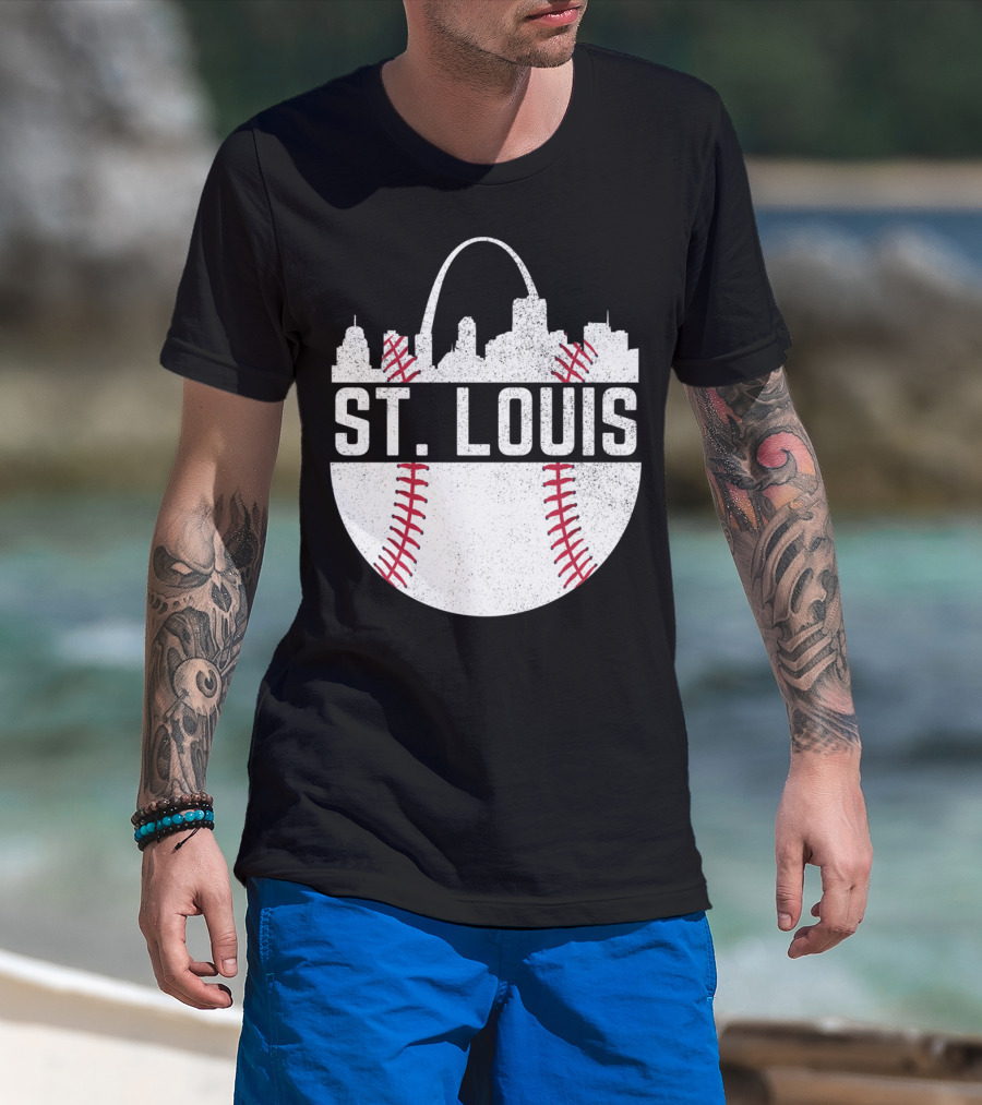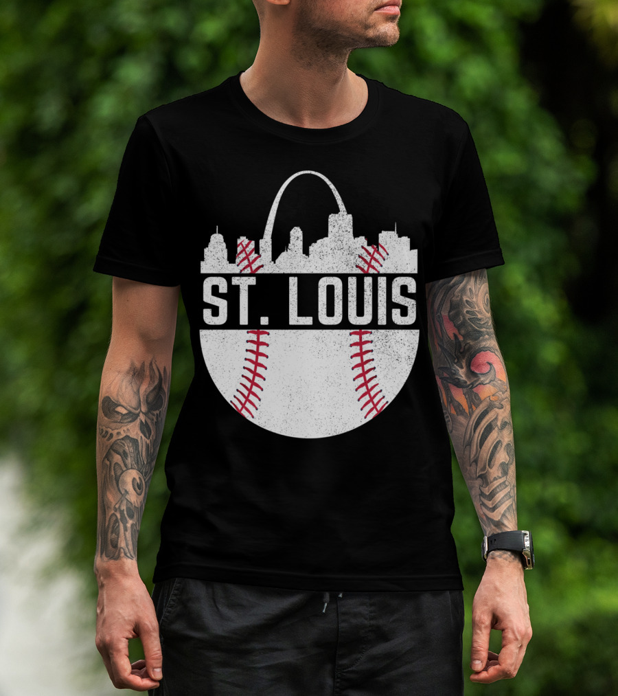 The St Louis Baseball Skyline Arch T-shirt is designed for everyday wear and a consistent fit. Fabric is pre-shrunk ring-spun cotton with durable stitching. See the size chart below for exact measurements.