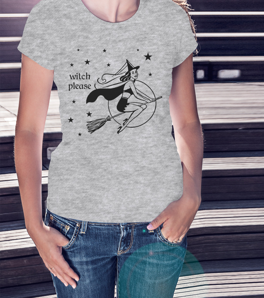 The Witch Please Vintage Flying Witch Broomstick Moon Stars T-shirt is designed for everyday wear and a consistent fit. Fabric is pre-shrunk ring-spun cotton with durable stitching. See the size chart below for exact measurements.