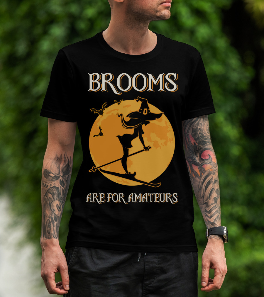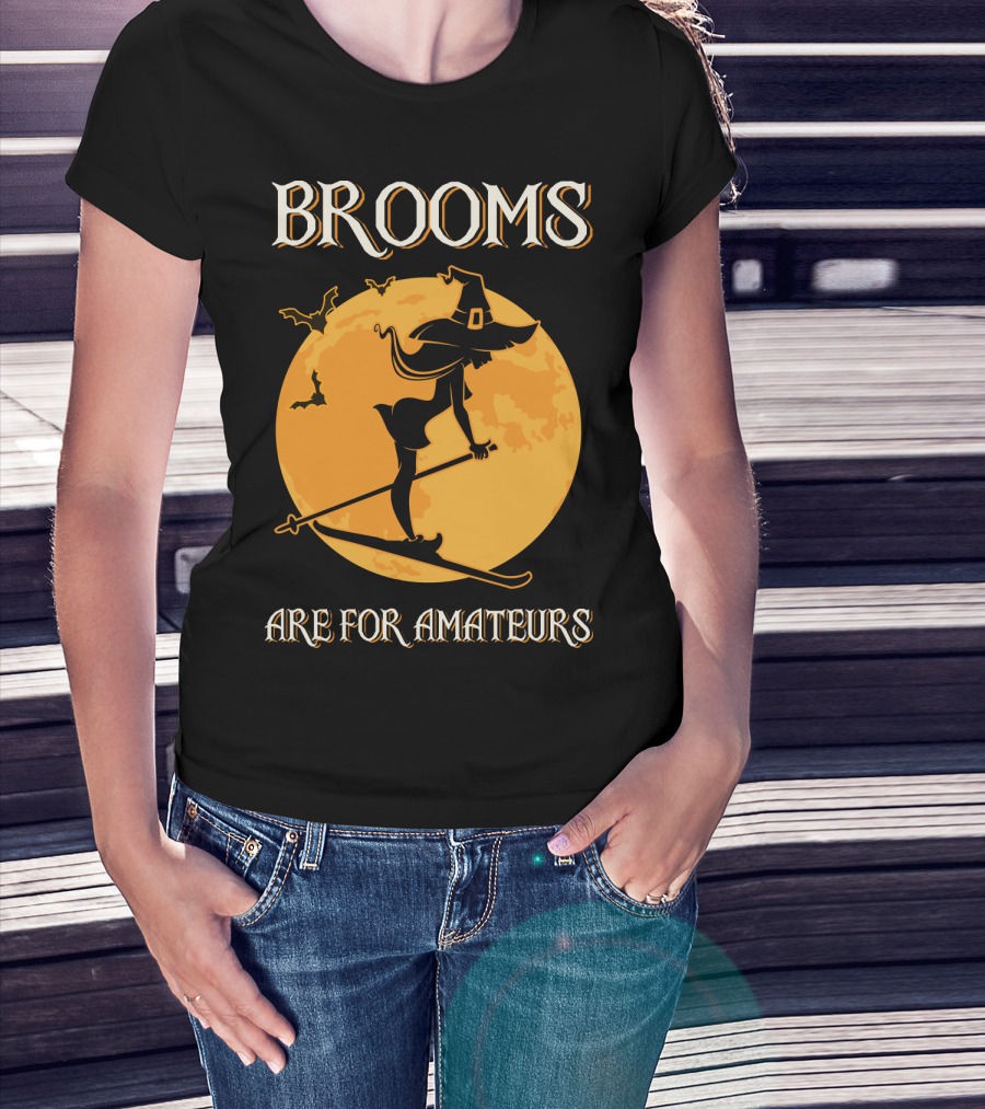 Brooms Are For Amateurs Witch Skiing Silhouette Halloween Moon T-Shirt