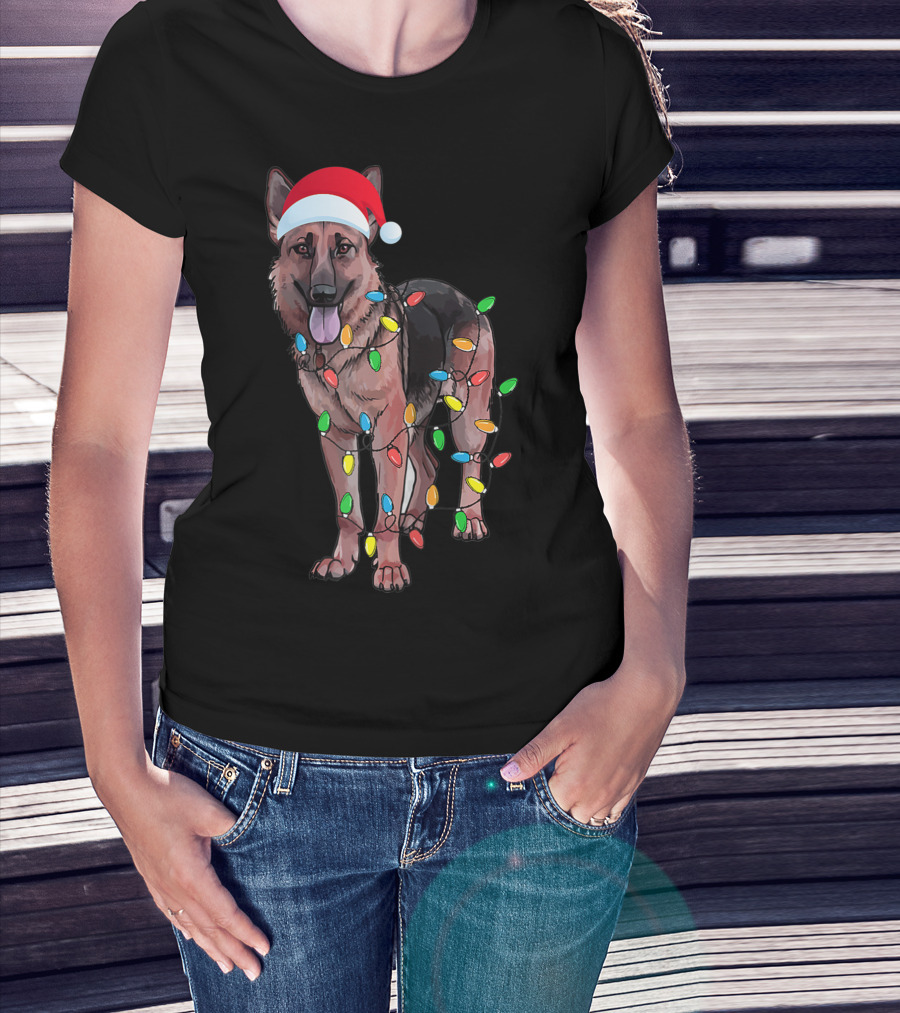 Christmas German Shepherd Dog Santa Hat Wrapped In Lights T-Shirt