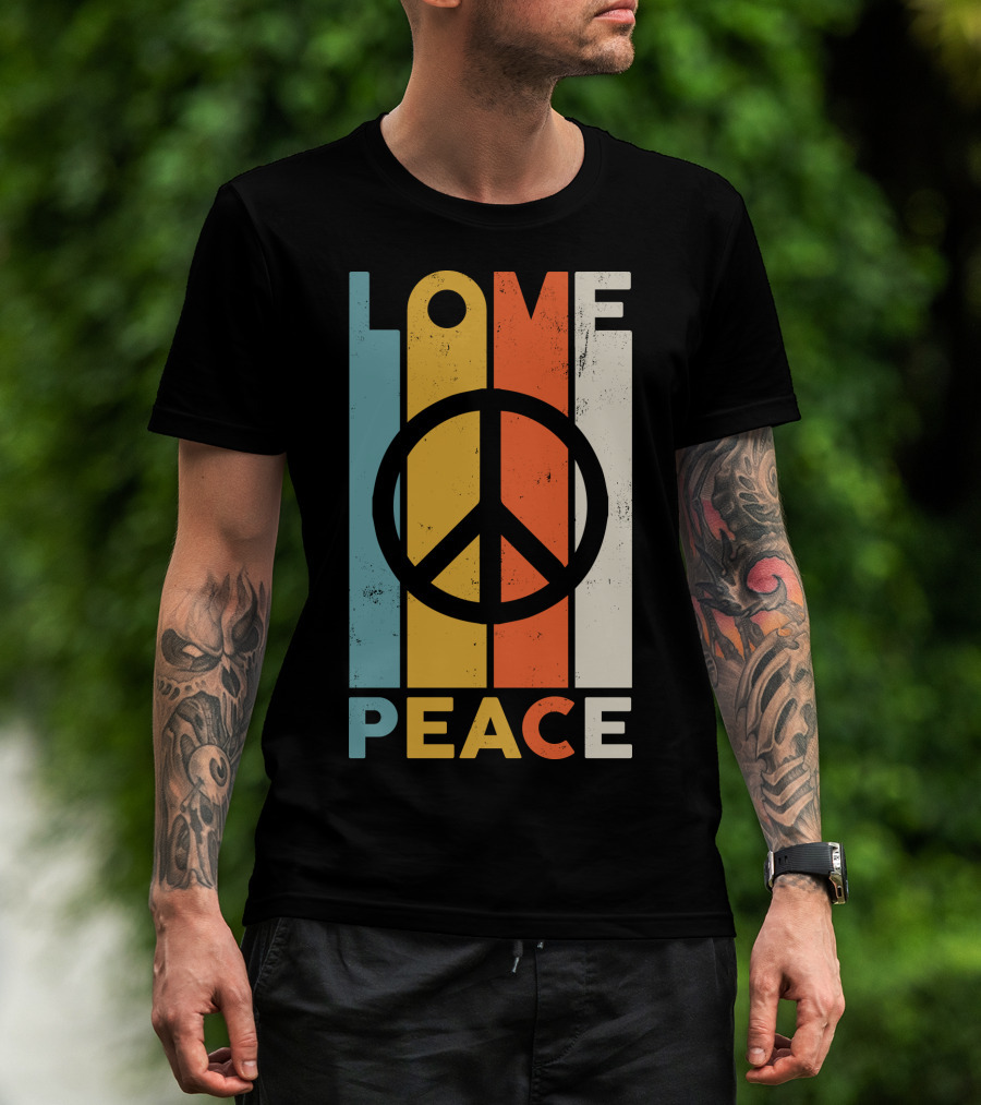 The LOVE Peace Sign Vintage Stripes T-shirt is designed for everyday wear and a consistent fit. Fabric is pre-shrunk ring-spun cotton with durable stitching. See the size chart below for exact measurements.