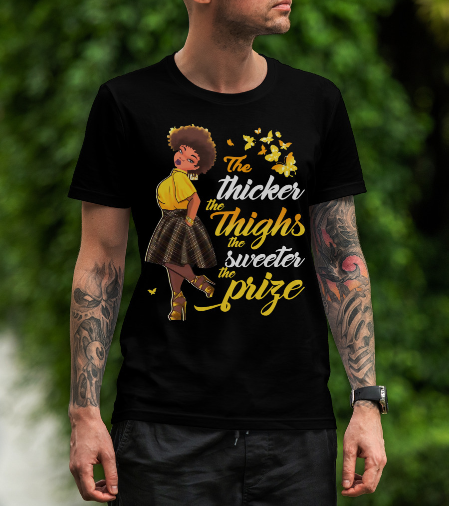The Thicker The Thighs The Sweeter The Prize Butterfly Woman In Yellow And Plaid Skirt T-Shirt