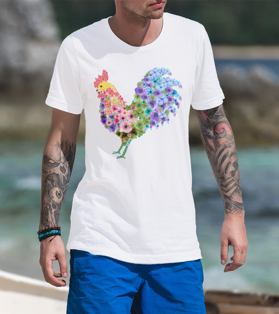 The CHICKEN Flower Patterned Rooster with Vibrant Floral Colors T-shirt is designed for everyday wear and a consistent fit. Fabric is pre-shrunk ring-spun cotton with durable stitching. See the size chart below for exact measurements.