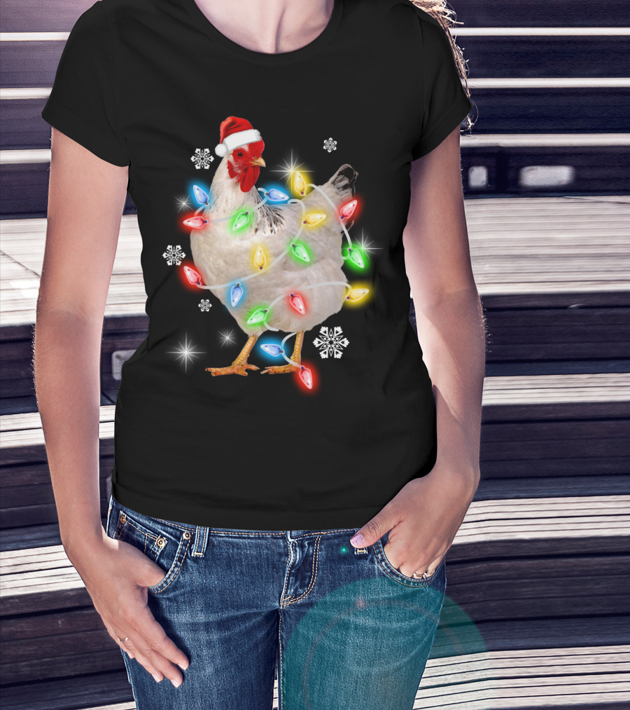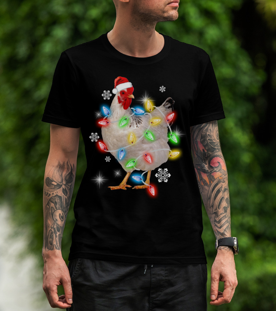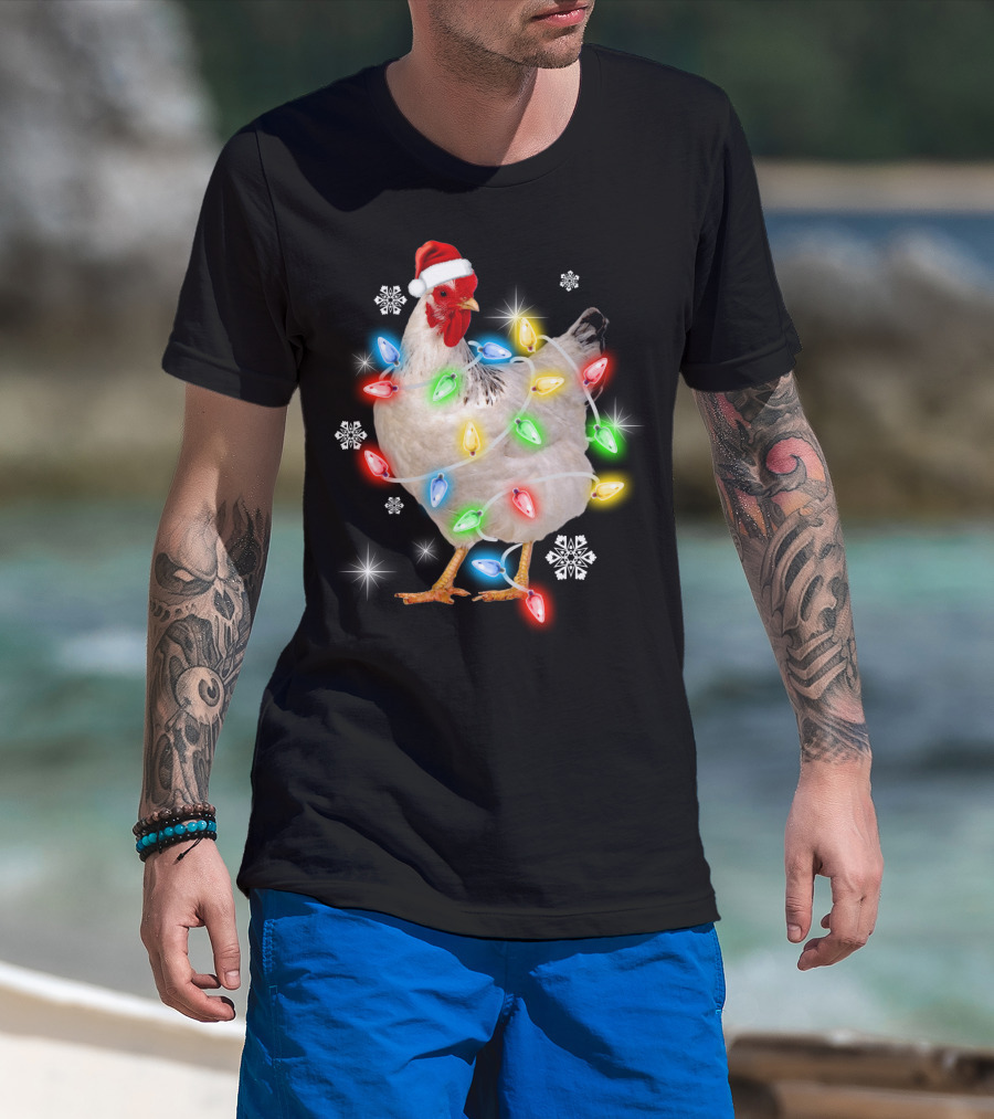 Chicken Noel Christmas Lights Santa Hat Snowflakes T-Shirt