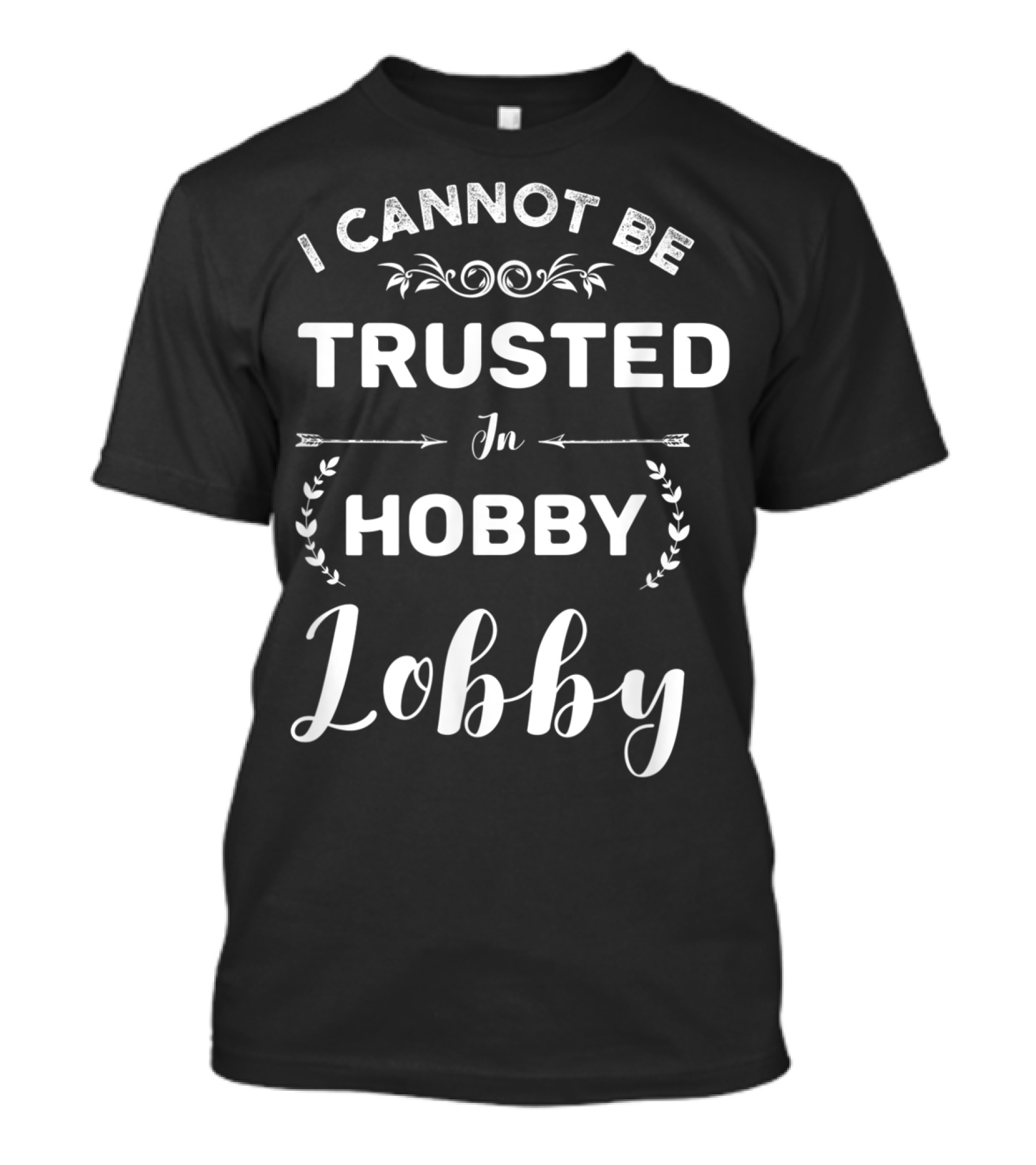 The I Cannot Be Trusted in Hobby Lobby Funny Statement with Decorative Elements T-shirt is designed for everyday wear and a consistent fit. Fabric is pre-shrunk ring-spun cotton with durable stitching. See the size chart below for exact measurements.
