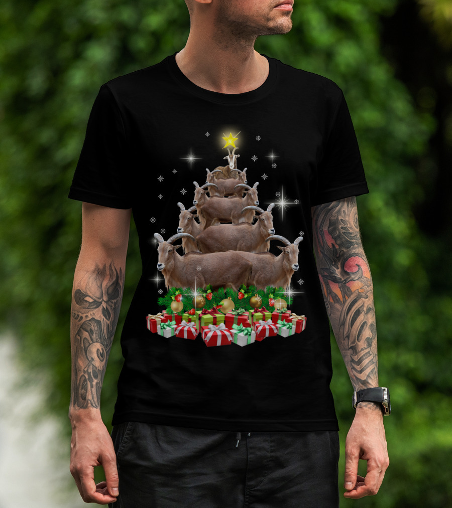 The Goat Christmas Tree With Presents and Star T-shirt is designed for everyday wear and a consistent fit. Fabric is pre-shrunk ring-spun cotton with durable stitching. See the size chart below for exact measurements.