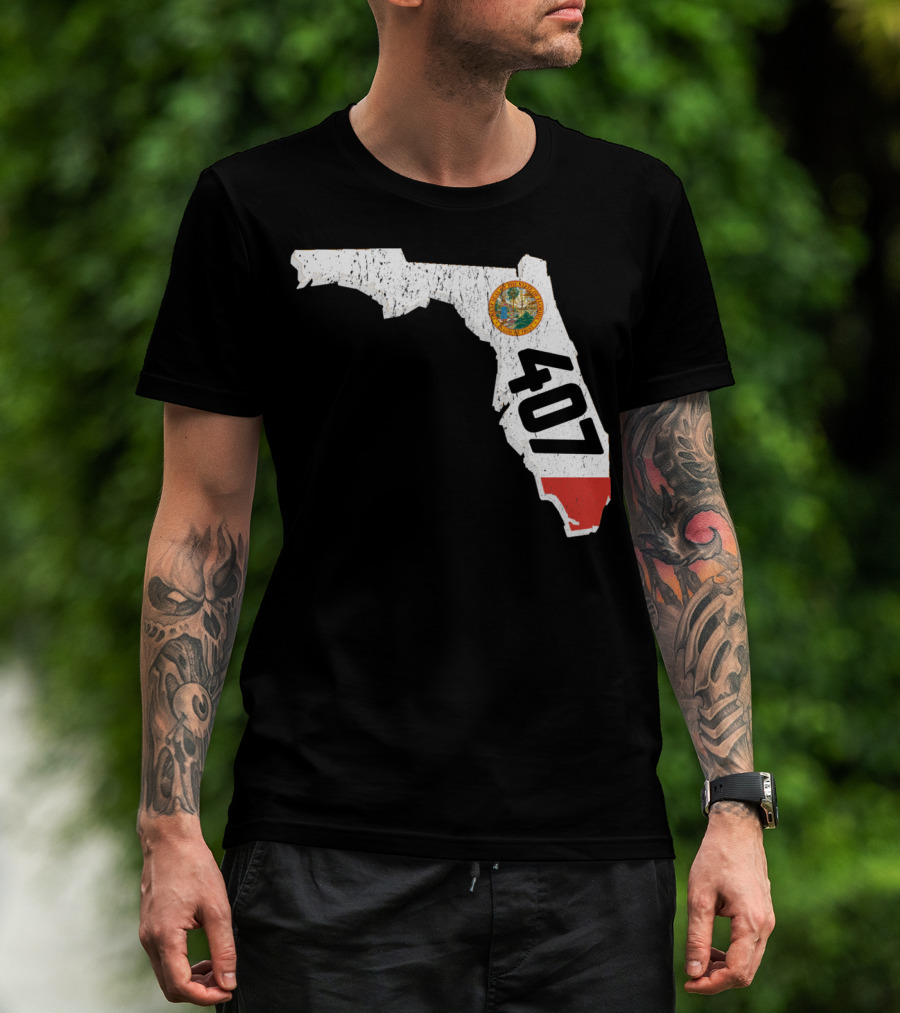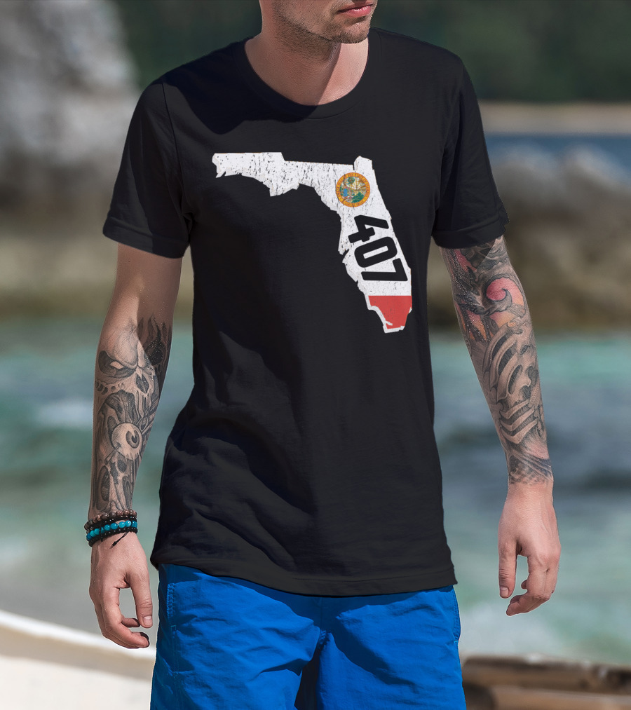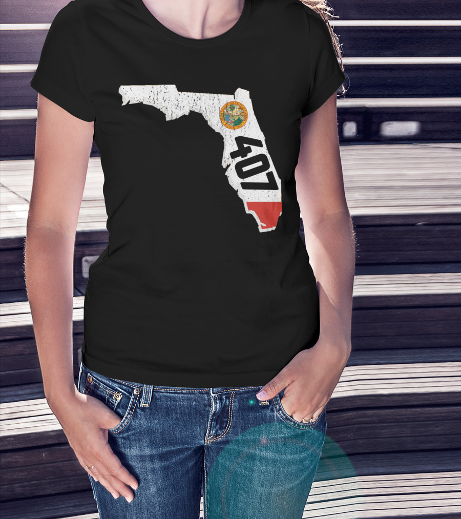 Florida Map Outline With State Seal And 407 Area Code T-Shirt