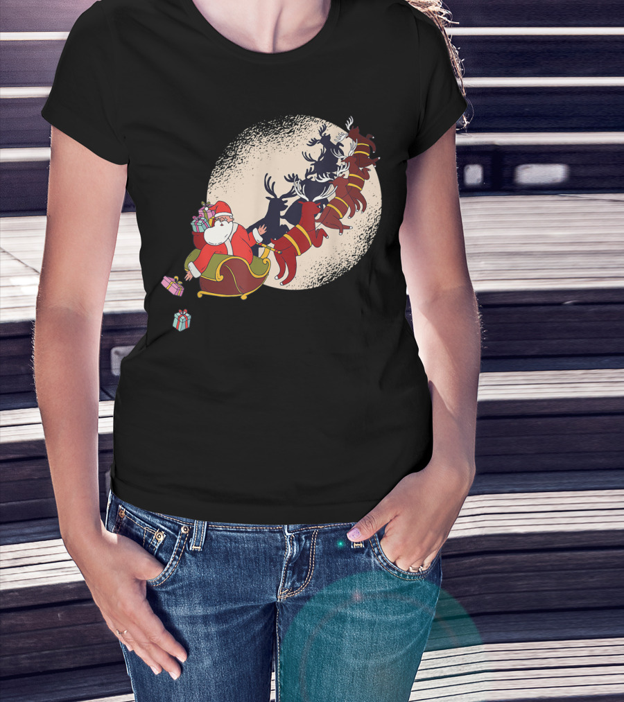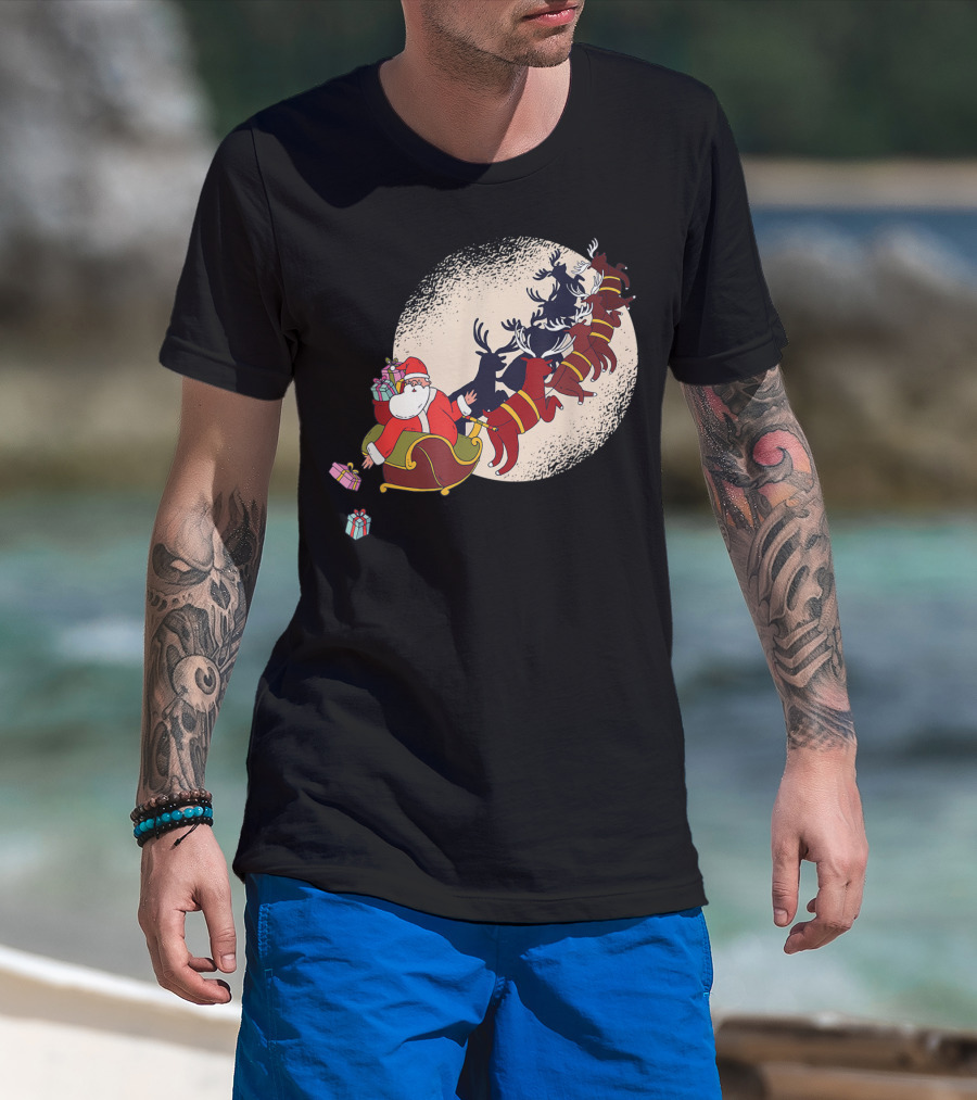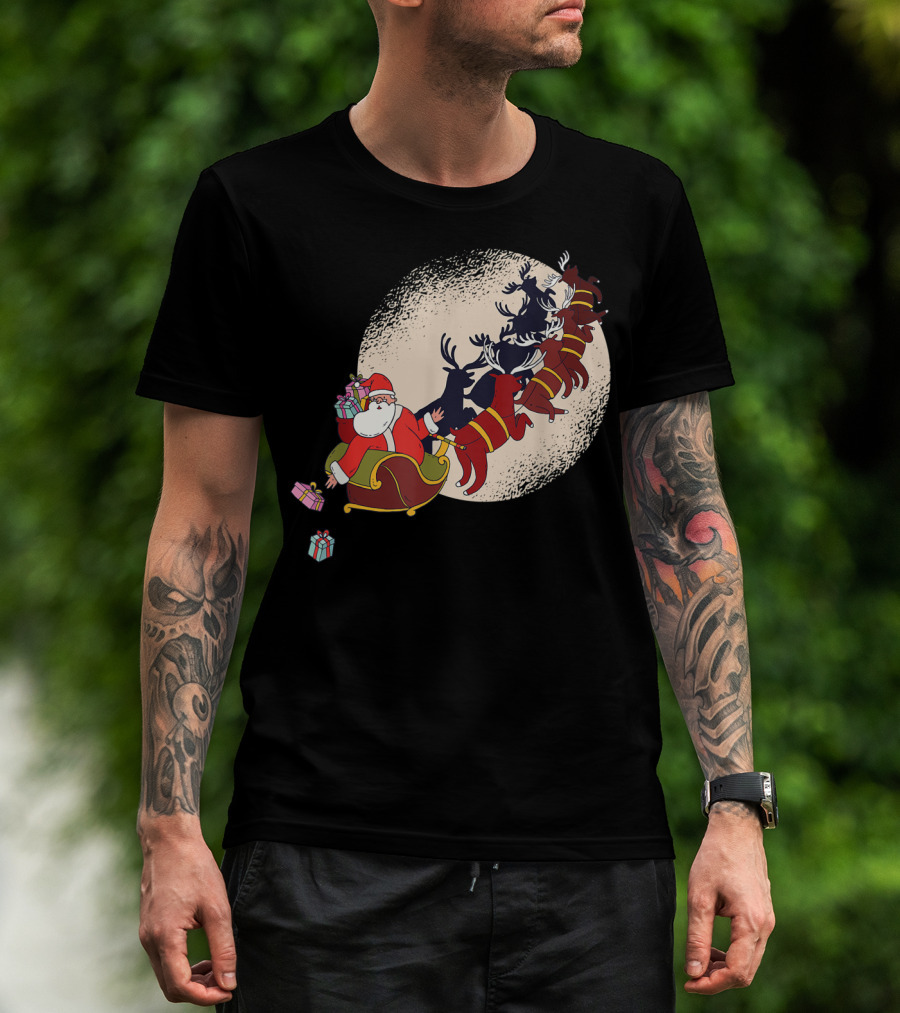 Santa Claus Flying With Reindeers Silhouette Under Full Moon Carrying Gift Sack T-Shirt