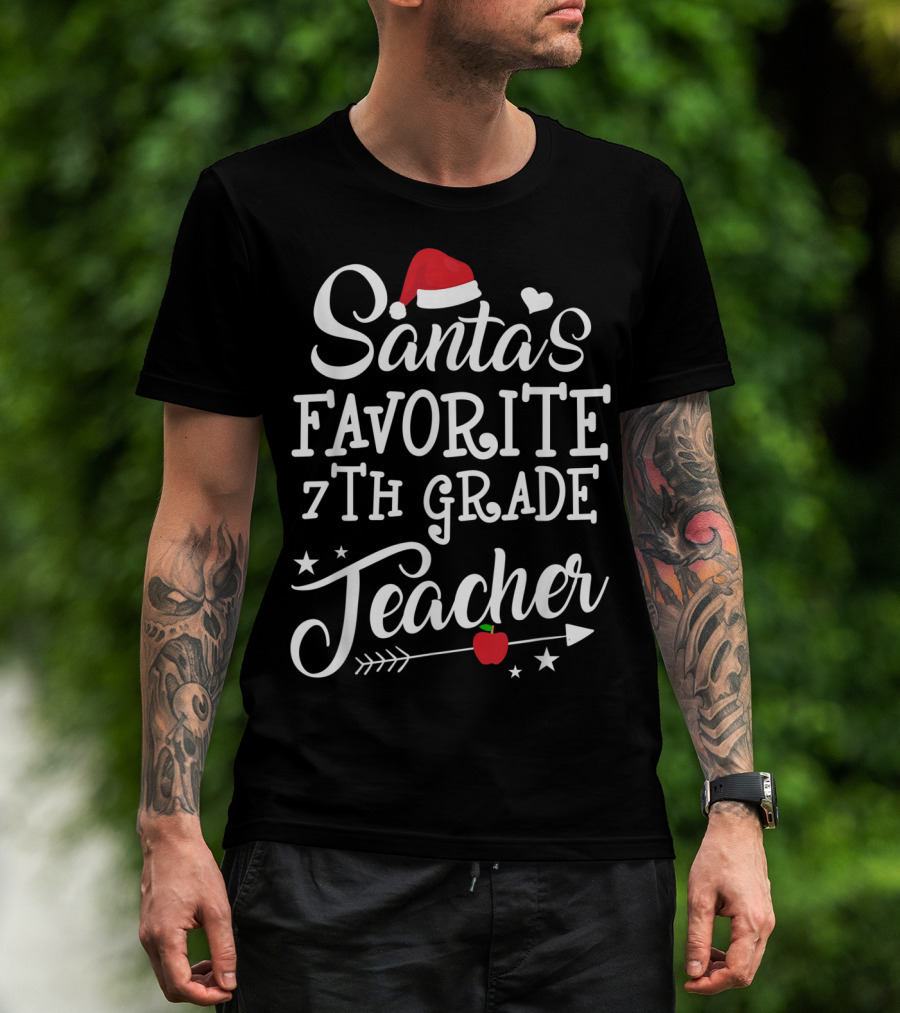 Santa's Favorite 7th Grade Teacher Christmas Apple Arrow Hat Stars T-Shirt