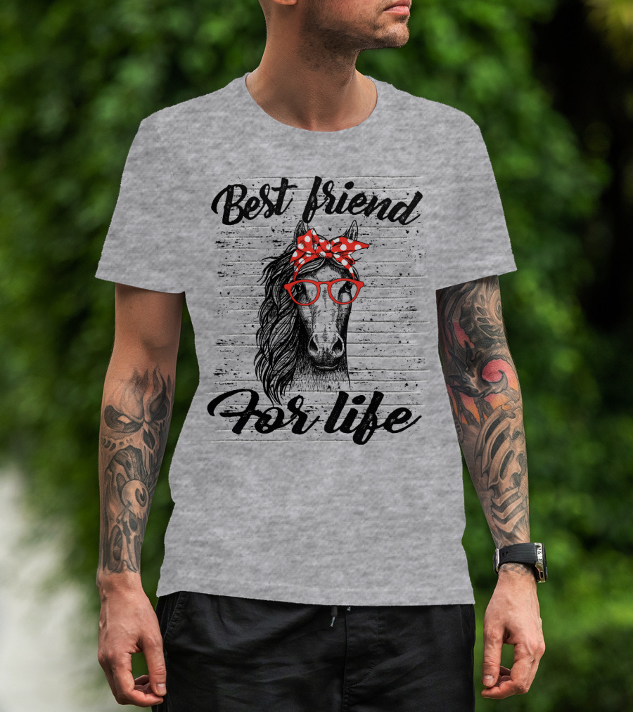 The Best Friend For Life Horse with Red Polka Dot Bow and Glasses T-shirt is designed for everyday wear and a consistent fit. Fabric is pre-shrunk ring-spun cotton with durable stitching. See the size chart below for exact measurements.