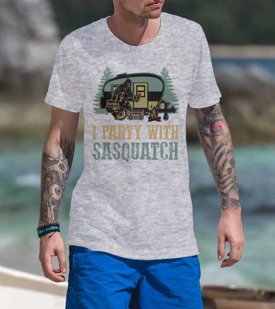 I Party With Sasquatch Beer Campfire Boombox Trailer Adventure T-Shirt