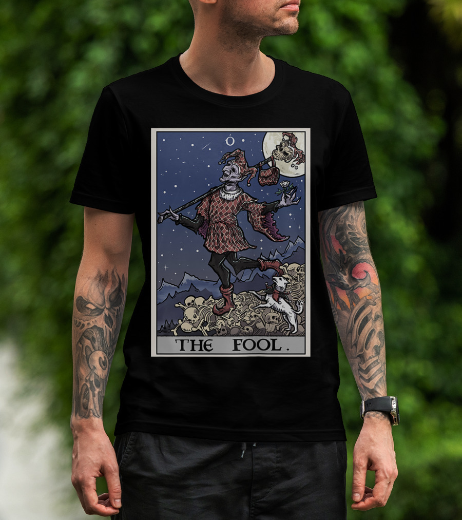 The The Fool Tarot Card Gothic Halloween Jester on Skull Pile T-shirt is designed for everyday wear and a consistent fit. Fabric is pre-shrunk ring-spun cotton with durable stitching. See the size chart below for exact measurements.
