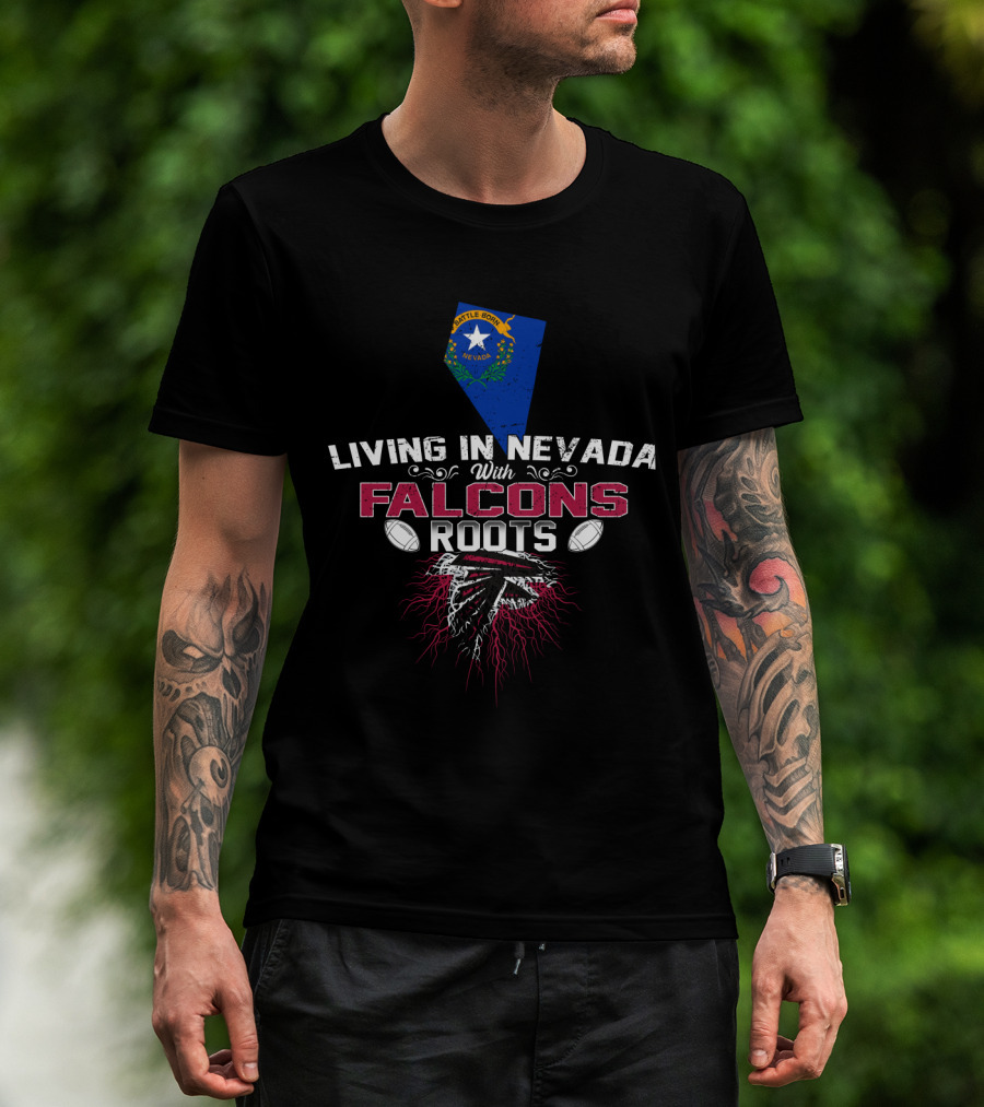 The Living In Nevada With Falcons Roots Nevada State Flag Falcons Logo Football Roots T-shirt is designed for everyday wear and a consistent fit. Fabric is pre-shrunk ring-spun cotton with durable stitching. See the size chart below for exact measurements.